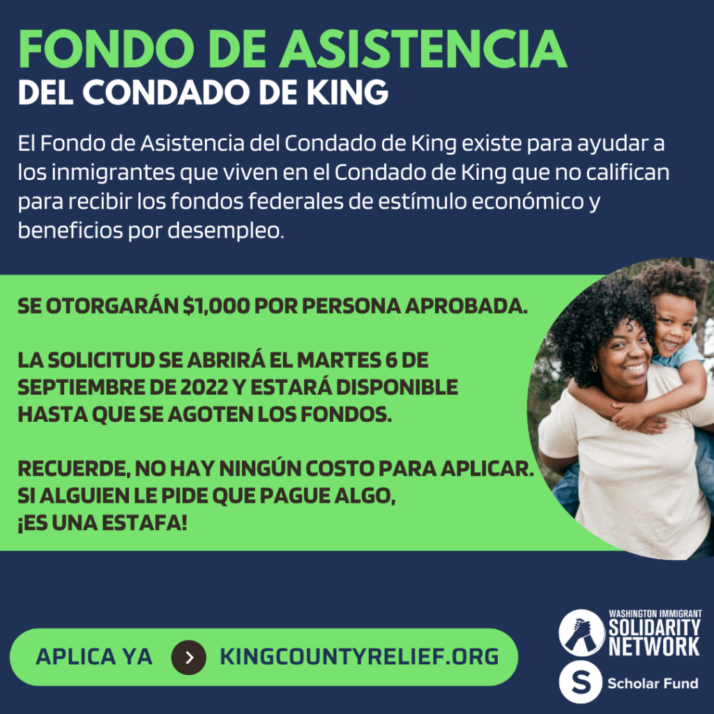 Fondo 1: El Fondo de Asistencia del Condado de King está aquí para ayudar a los residentes inmigrantes del Condado de King que no son elegibles para el dinero del estímulo federal y los beneficios de desempleo. ¡Los solicitantes aprobados pueden recibir $1,000!
