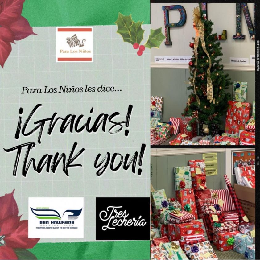 While many adult students wrote about customs practiced in their home countries, a few described new family holiday traditions celebrated in the United States. For several years, PLN has gathered holiday toys for participants in our programs. In the face of a pandemic that has devastated many families’ finances, it made sense to continue this new holiday tradition. Nationally renowned bakery, Tres Lecheria, partnered with us again this year. Then the Sea Hawkers Latin American booster club joined in, and we were able to make even more wishes come true.