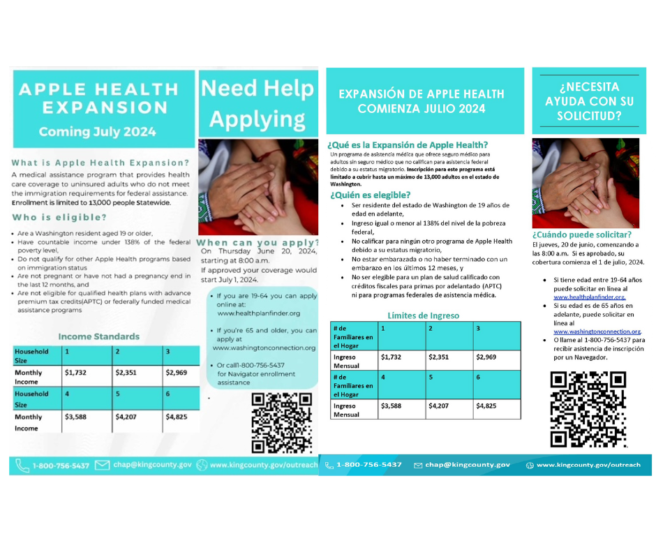 La inscripción se abre el jueves 20 de junio para empezar con la cobertura a partir del 1 de julio. Por favor, inscríbase lo antes posible ya que el espacio en este nuevo programa es limitado. Para mayor información, visite https://bit.ly/applehealthexpansion