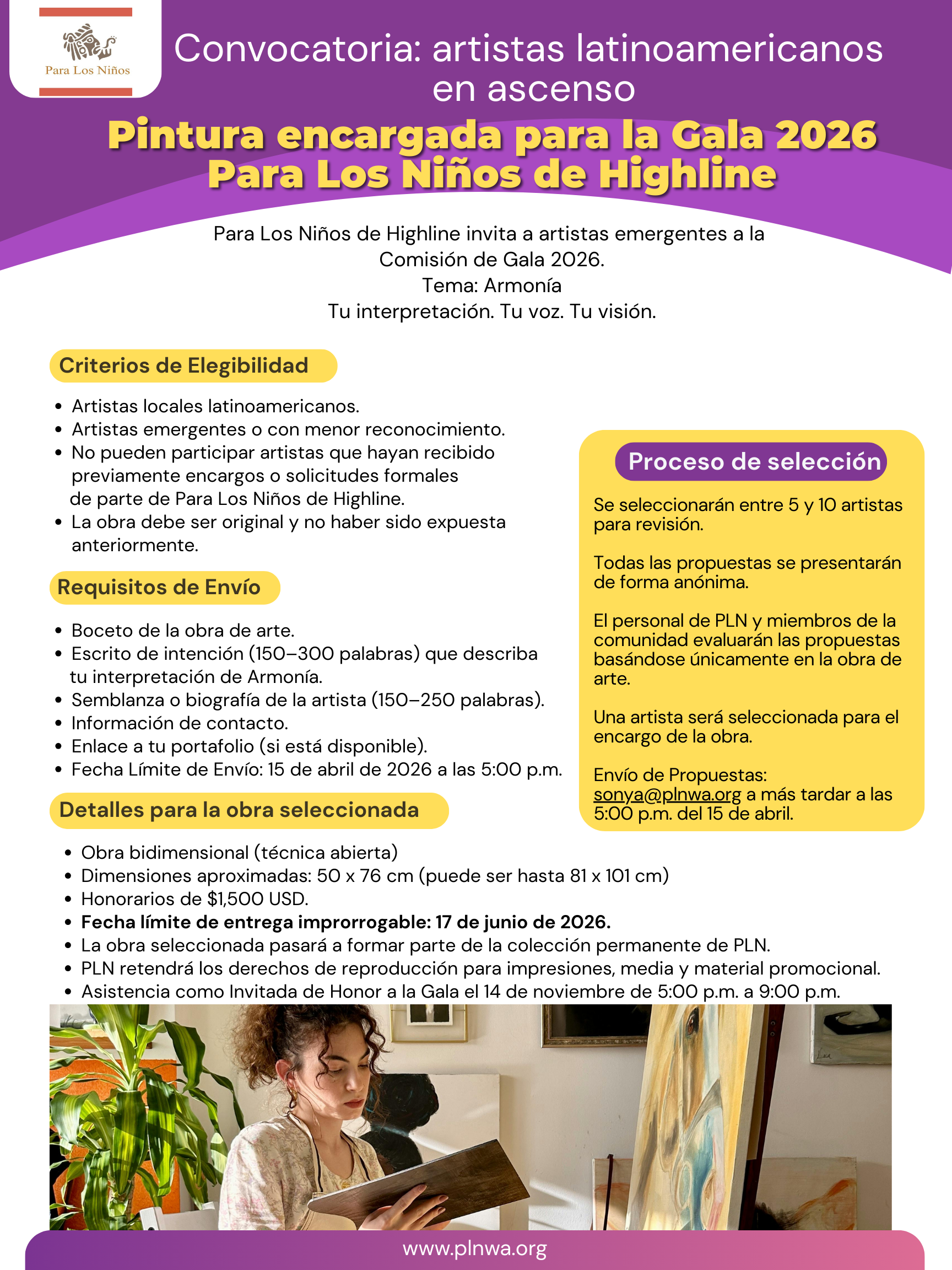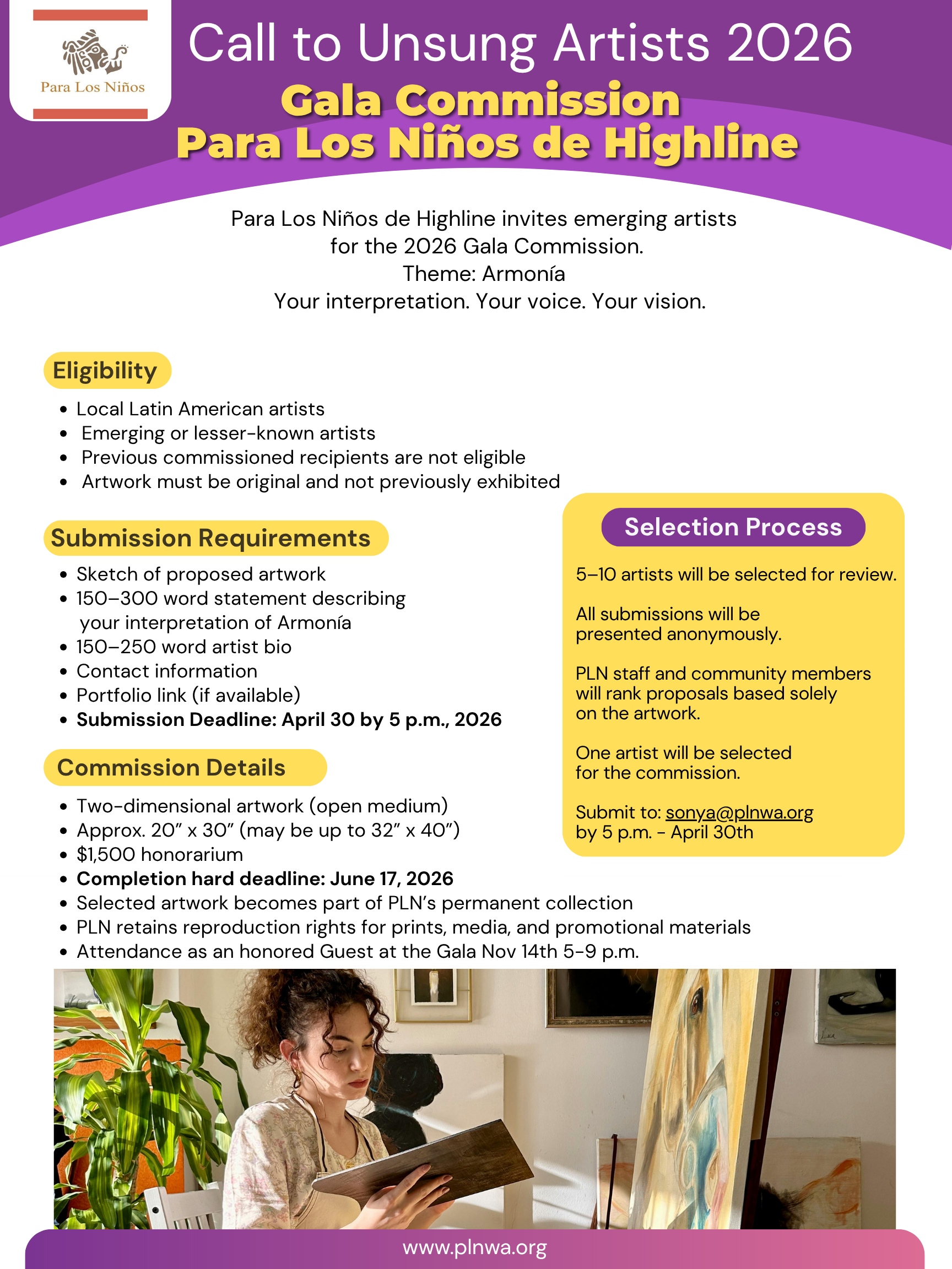 Para Los Niños de Highline invites local emerging Latino artists, or those who are not yet widely recognized, to submit proposals to create the commissioned artwork for our 2026 Gala, which this year will be centered on the theme “Harmony”.