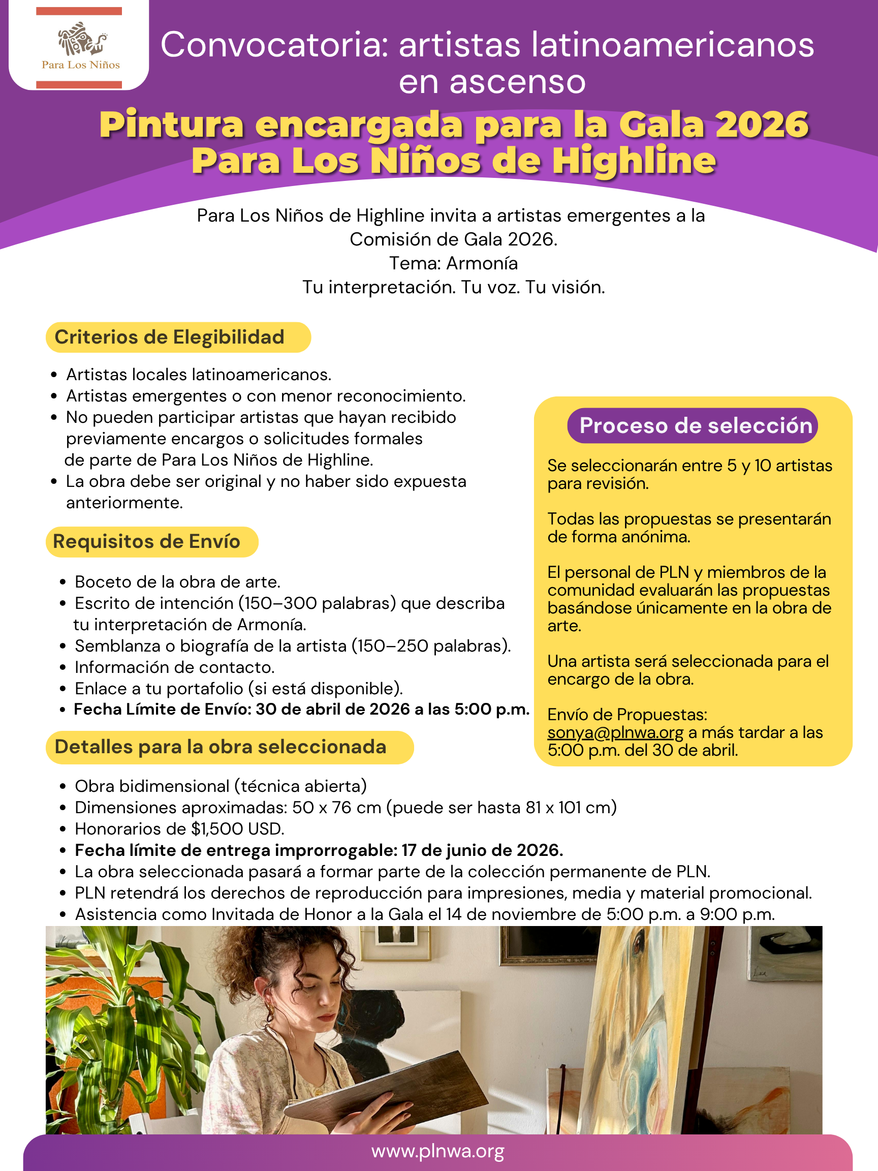Para Los Niños de Highline extiende una invitación a artistas locales latinoamericanos con trayectoria emergente o que aún no son ampliamente reconocidas para presentar una propuesta para la obra de arte que se comisionará para nuestra Gala 2026.
