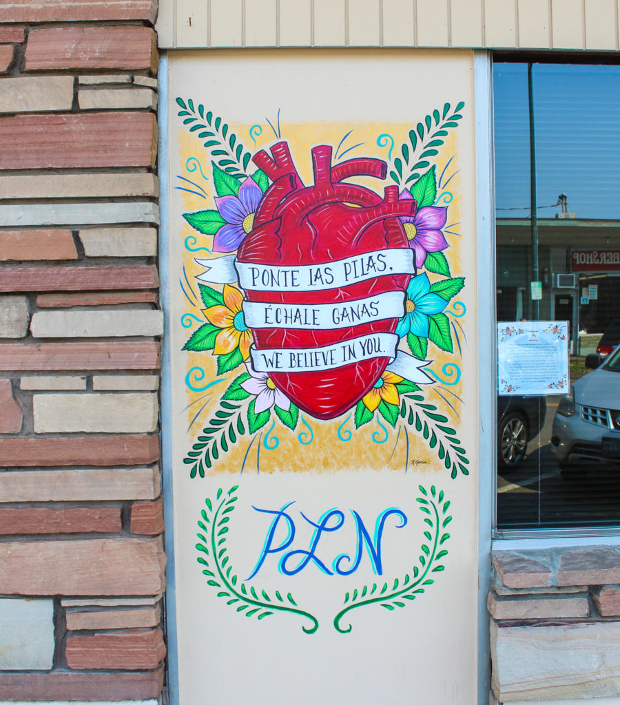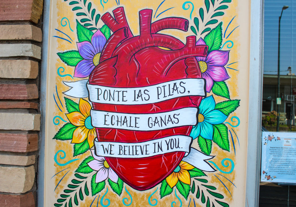 Welcome back to the virtual unveiling of our 4 new murals. We invite you to come and visit our new murals (3 of them are outside and can be viewed at any time). Art is of great importance to our community and this summer we have been able to create captivating murals at our Para Los Niños office. Our third virtual unveil is by artist Raquel García Martínez.