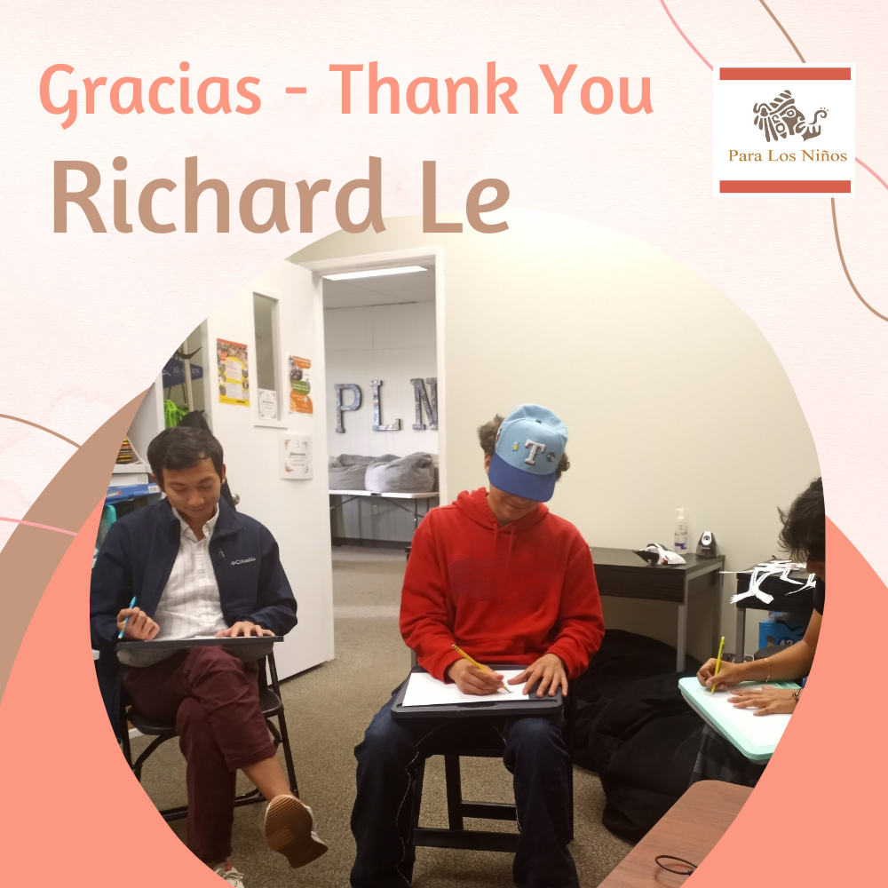 Queremos agradecer a Richard Le por ayudar a los jóvenes en el Programa Latinx. Él ha estado dando tutorías particulares a nuestros jóvenes y los ayuda con las tareas que abarcan los grados del 9 al 12 y materias como matemáticas e historia. Cuando hay tiempo libre, también se une a los juegos UNO, competencias de Smash Bros, trivia Kahoot y otras actividades.