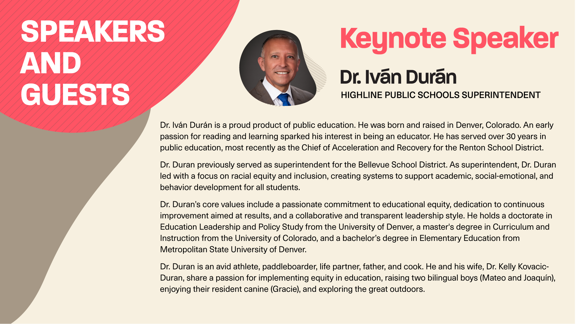 Celebrate in person with us at Club Sur on Saturday, November 5, 2022, starting at 4:30 PM with special live music from 5:00 pm to 6:00 pm by Sin Fronteras folklore. The Keynote speaker this year is new Highline Public Schools Superintendent, Dr. Ivan Duran.