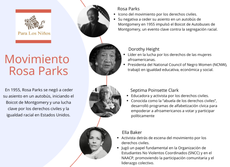 El movimiento de derechos civiles en Estados Unidos no solo tuvo figuras masculinas reconocidas como Martin Luther King Jr., sino también mujeres que fueron pilares fundamentales en la lucha por la igualdad racial. Rosa Parks, conocida como la “madre del movimiento por los derechos civiles”, se convirtió en un ícono internacional cuando en 1955 se negó a ceder su asiento a un hombre blanco en un autobús de Montgomery -,Alabama, desatando el histórico Boicot de Autobuses. Junto a ella, Dorothy Height trabajó incansablemente por los derechos de las mujeres afroamericanas, liderando el National Council of Negro Women y promoviendo la educación y el empoderamiento social.
